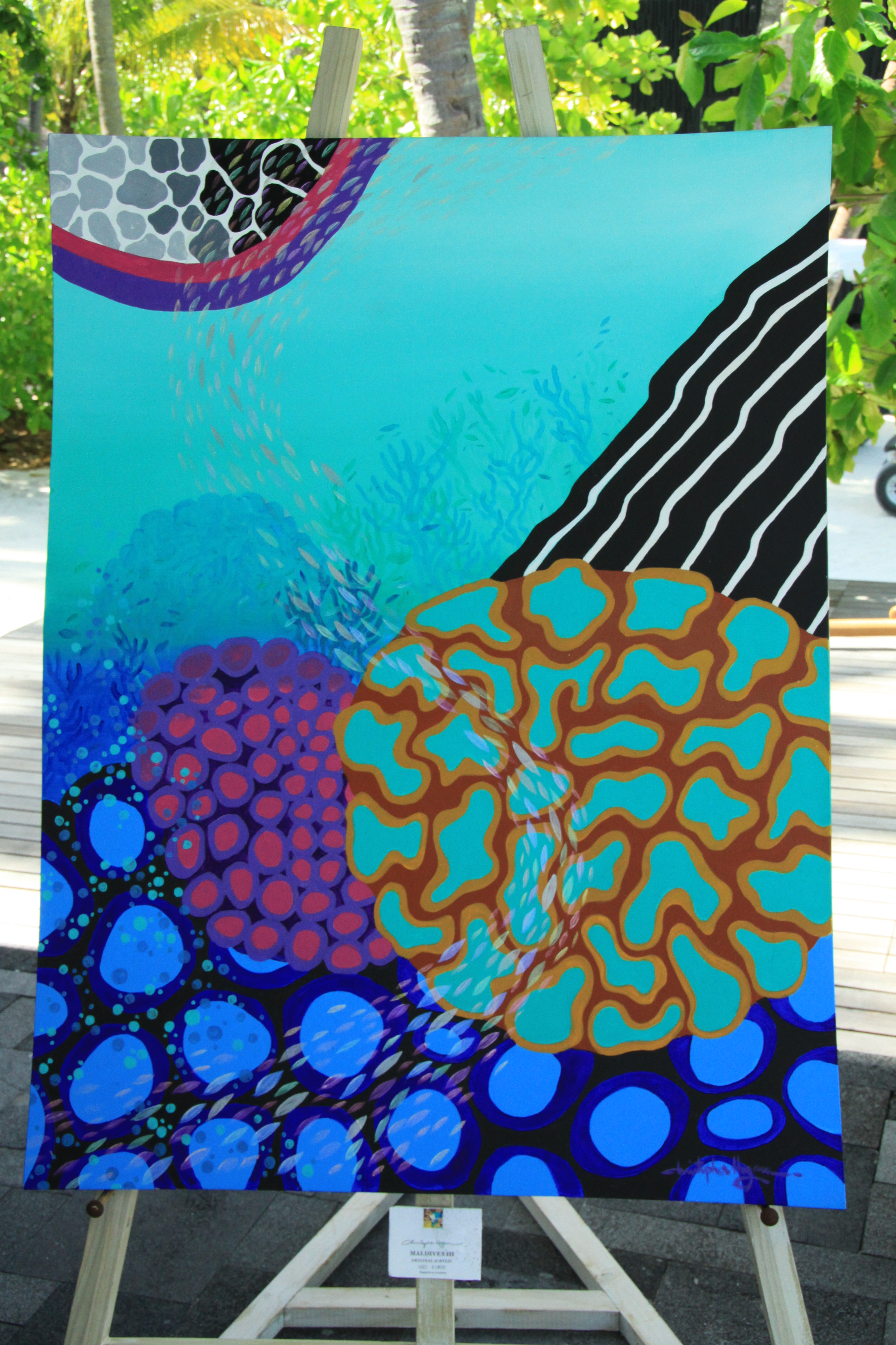 Bold combinations of the unique features of Maori Wrasse or Napoleon Fish, as they are know here in the Maldives and the bumpy textures and brilliant purples of the Crown Jellyfish have come alive for me in this painting.