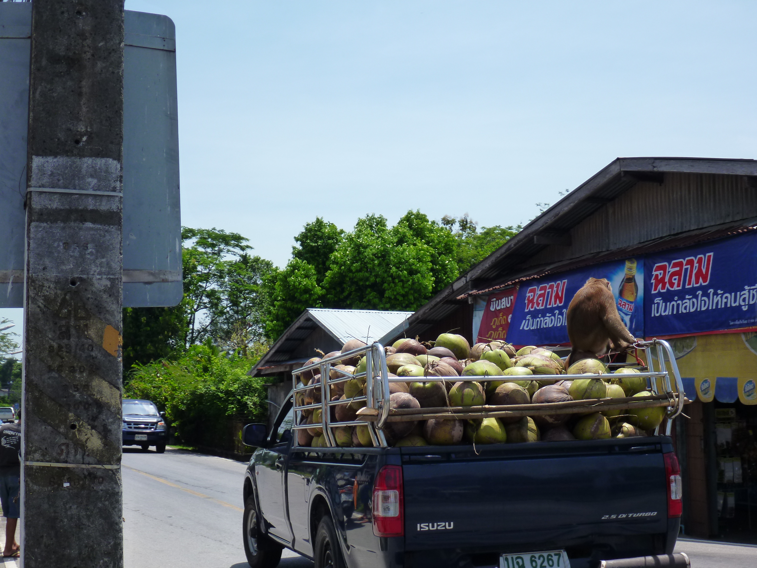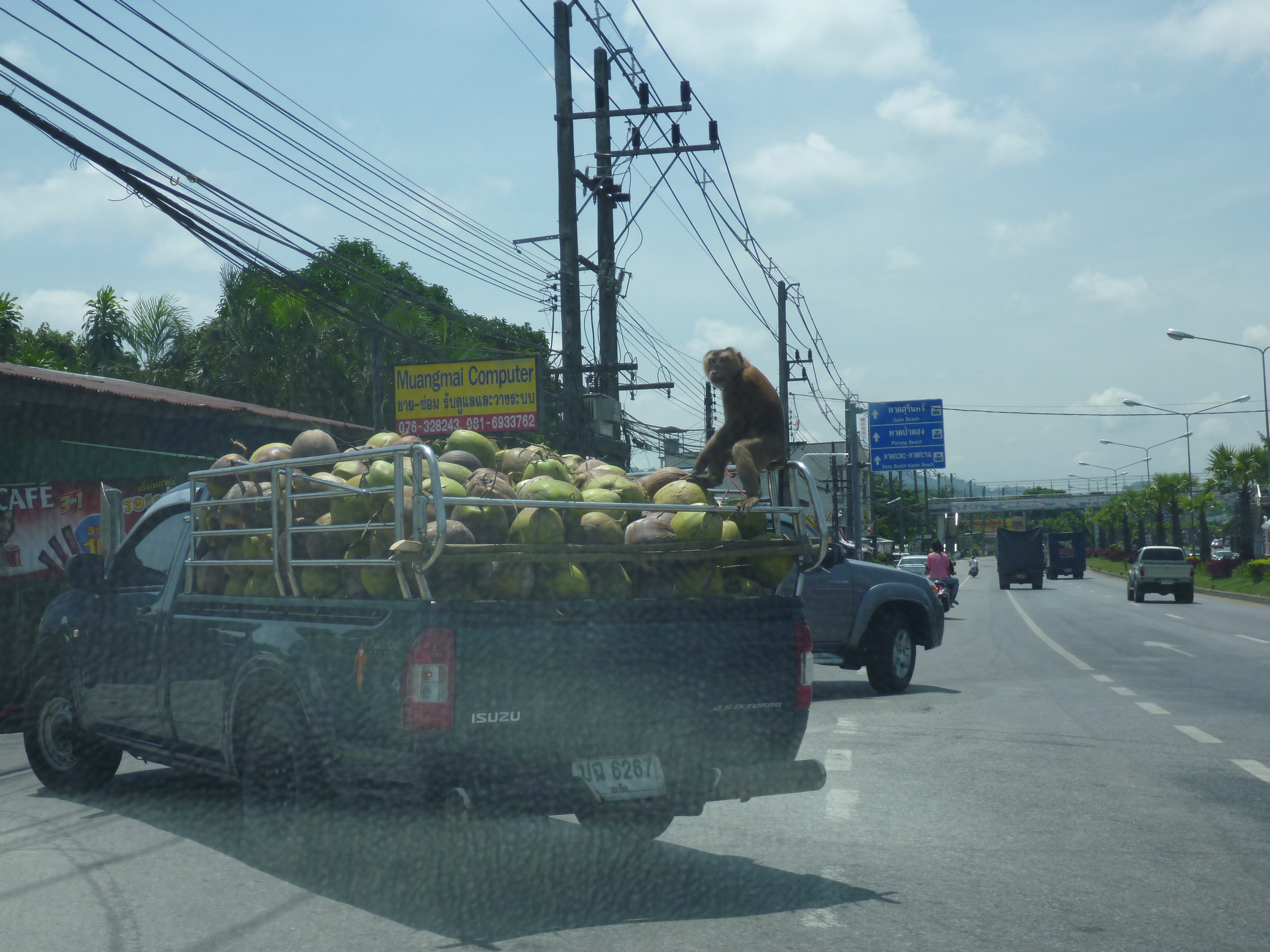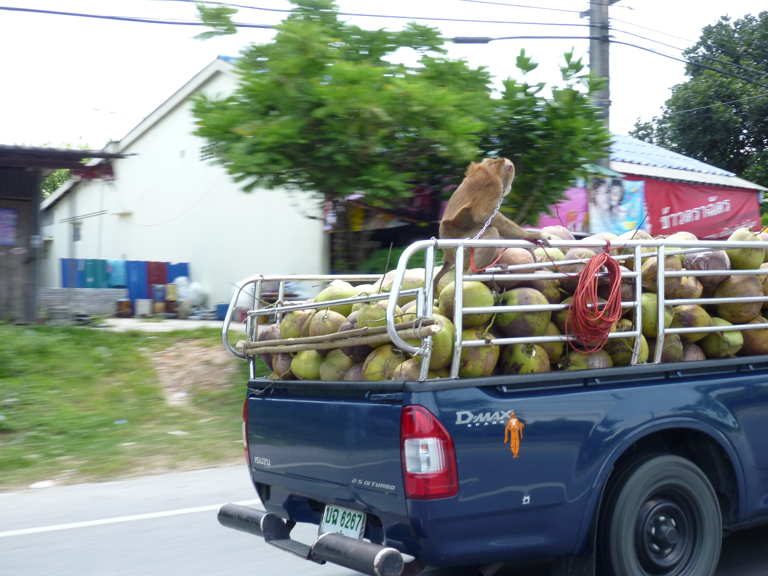 Driving back from Phuket Town we came up to a ute loaded with coconuts and on the back I thought I saw a monkey. Hope you like my pics and I have attached a press articles which highlight the work that these animals do in Thailand – interesting, now I know.