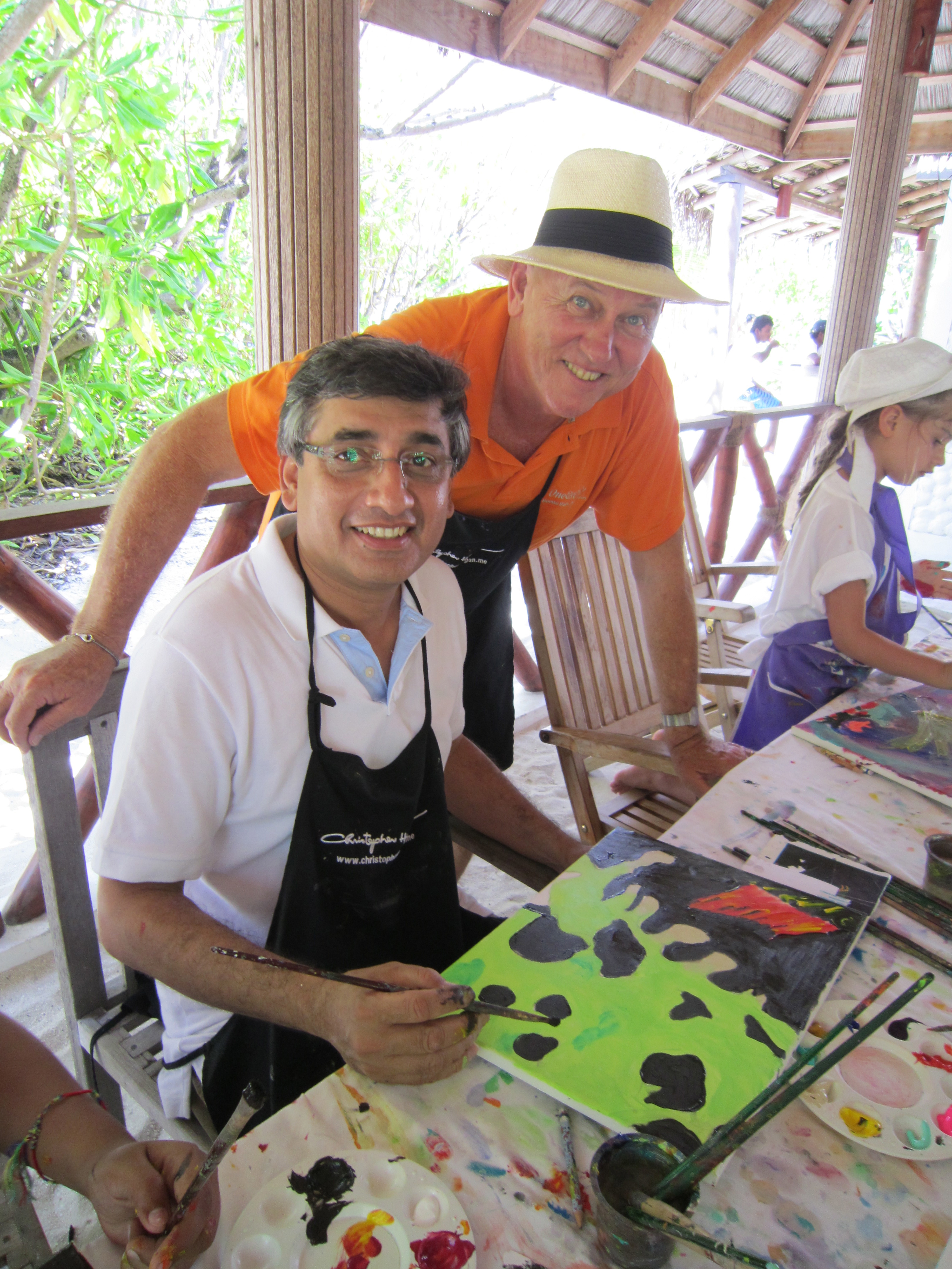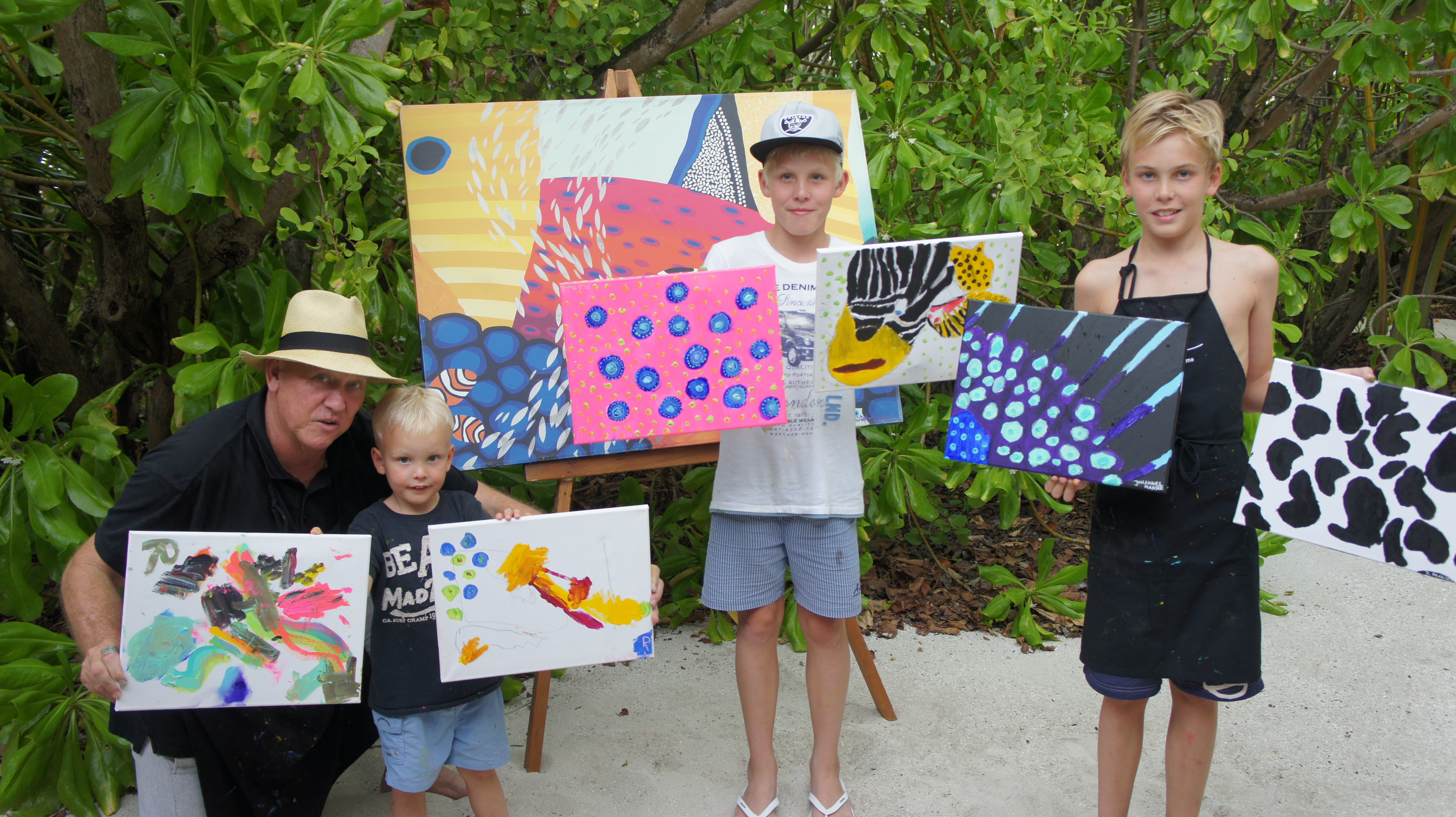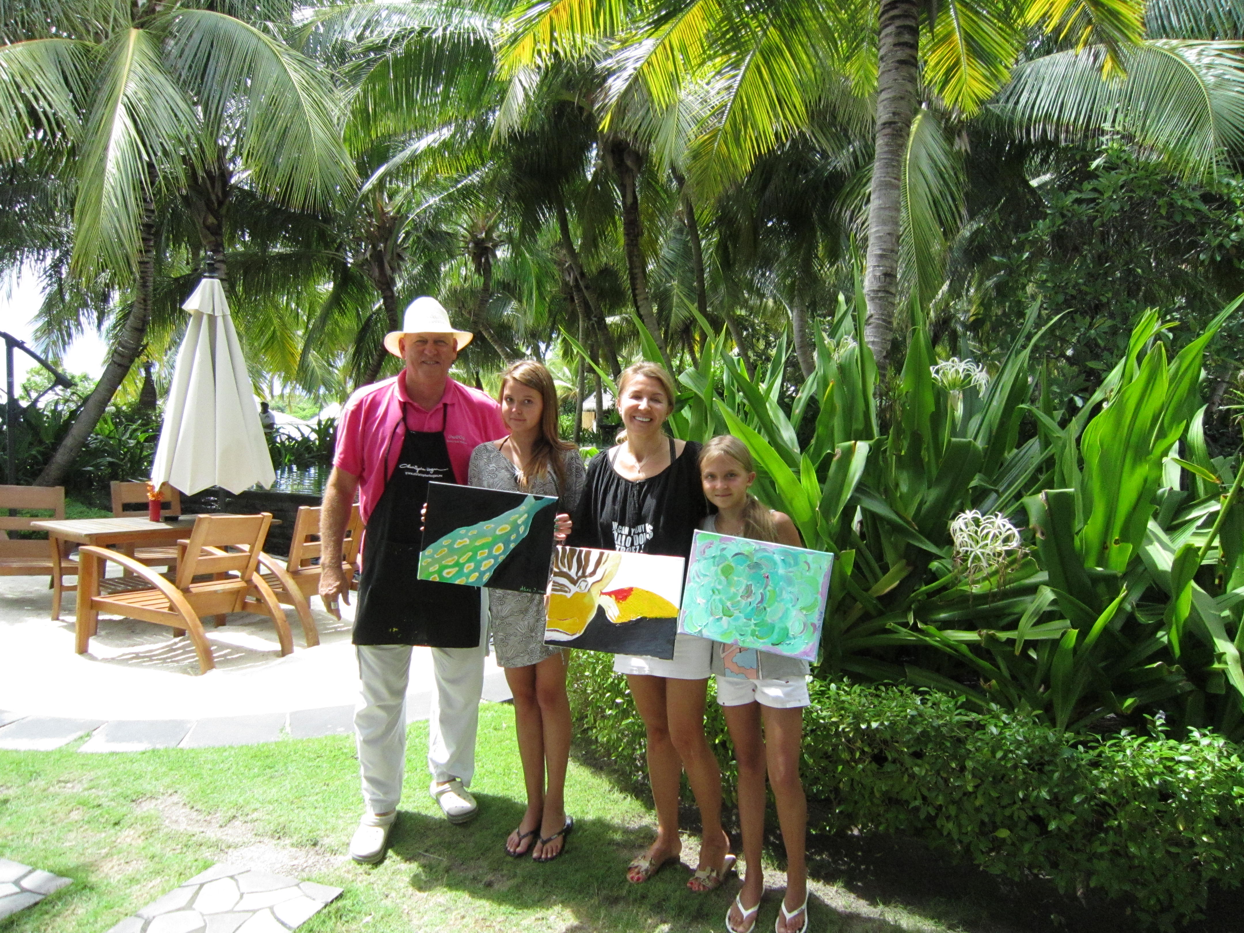 Nora, O&O Reethi Rah’s exuberant Guest Services Manager and her two young nieces joined my art class under the coconut trees and so I took the opportunity to teach them how to paint in the bold colours and patterns of the marine life that they had seen here on the reefs and waters of the Maldives.