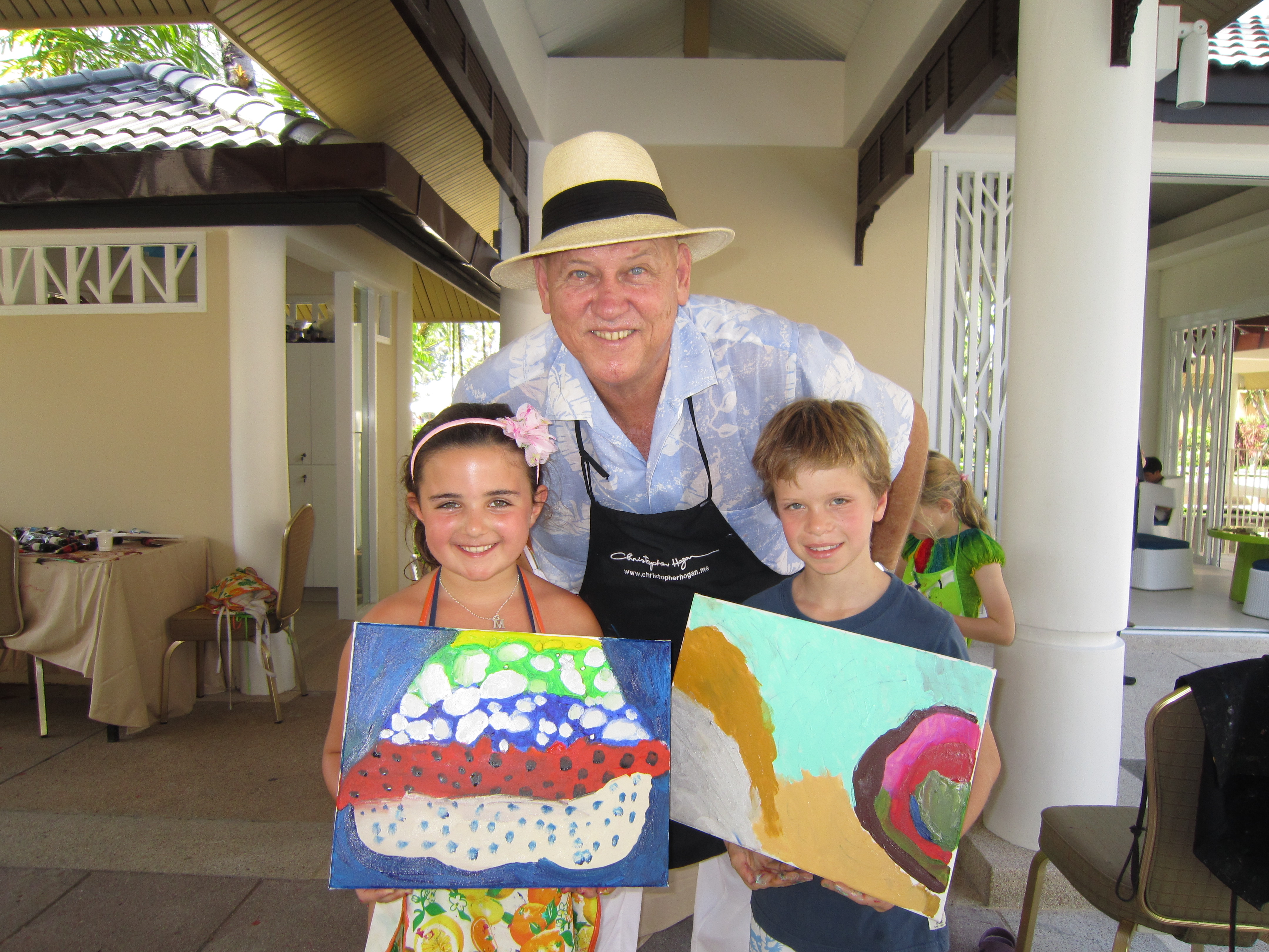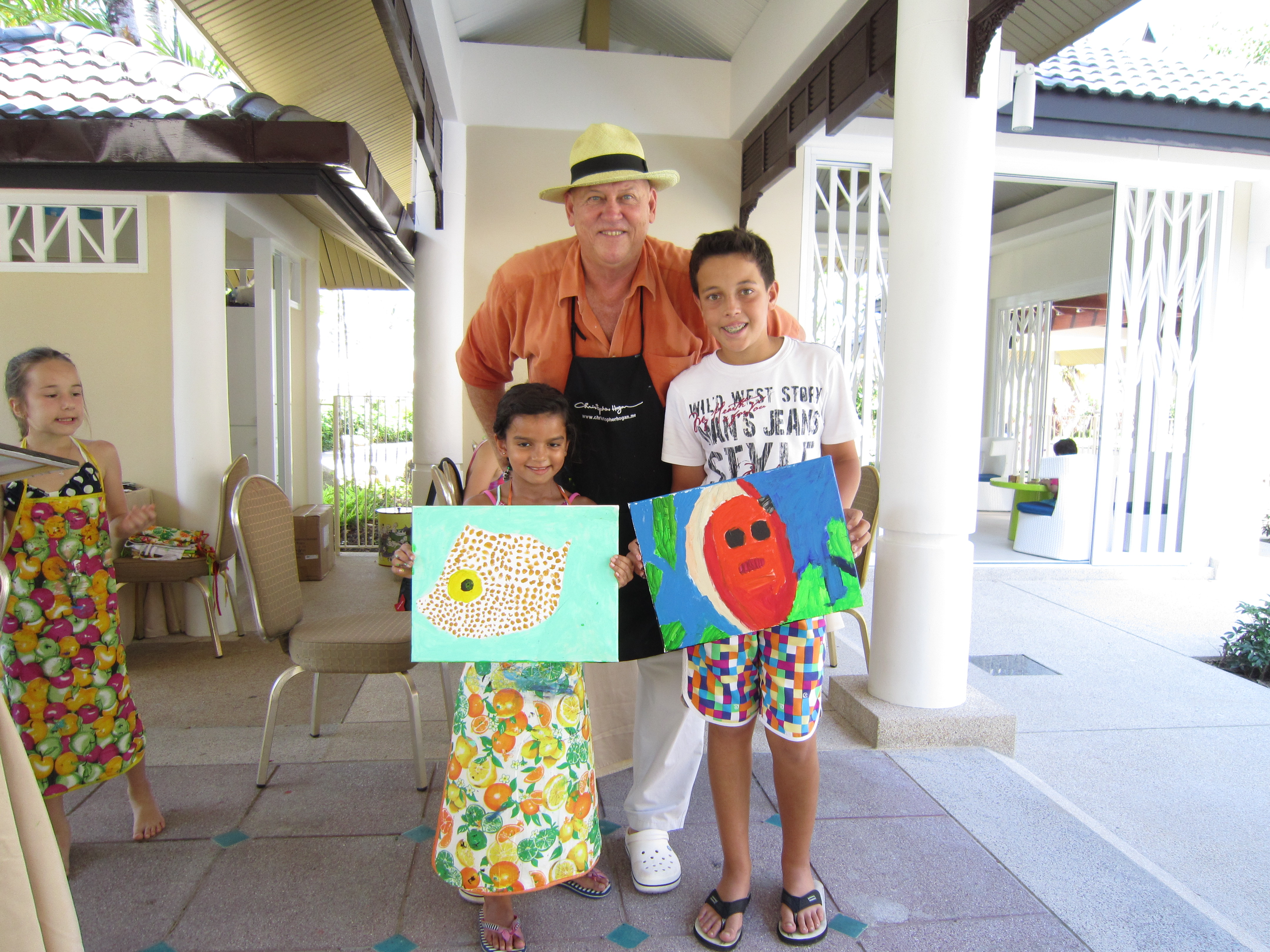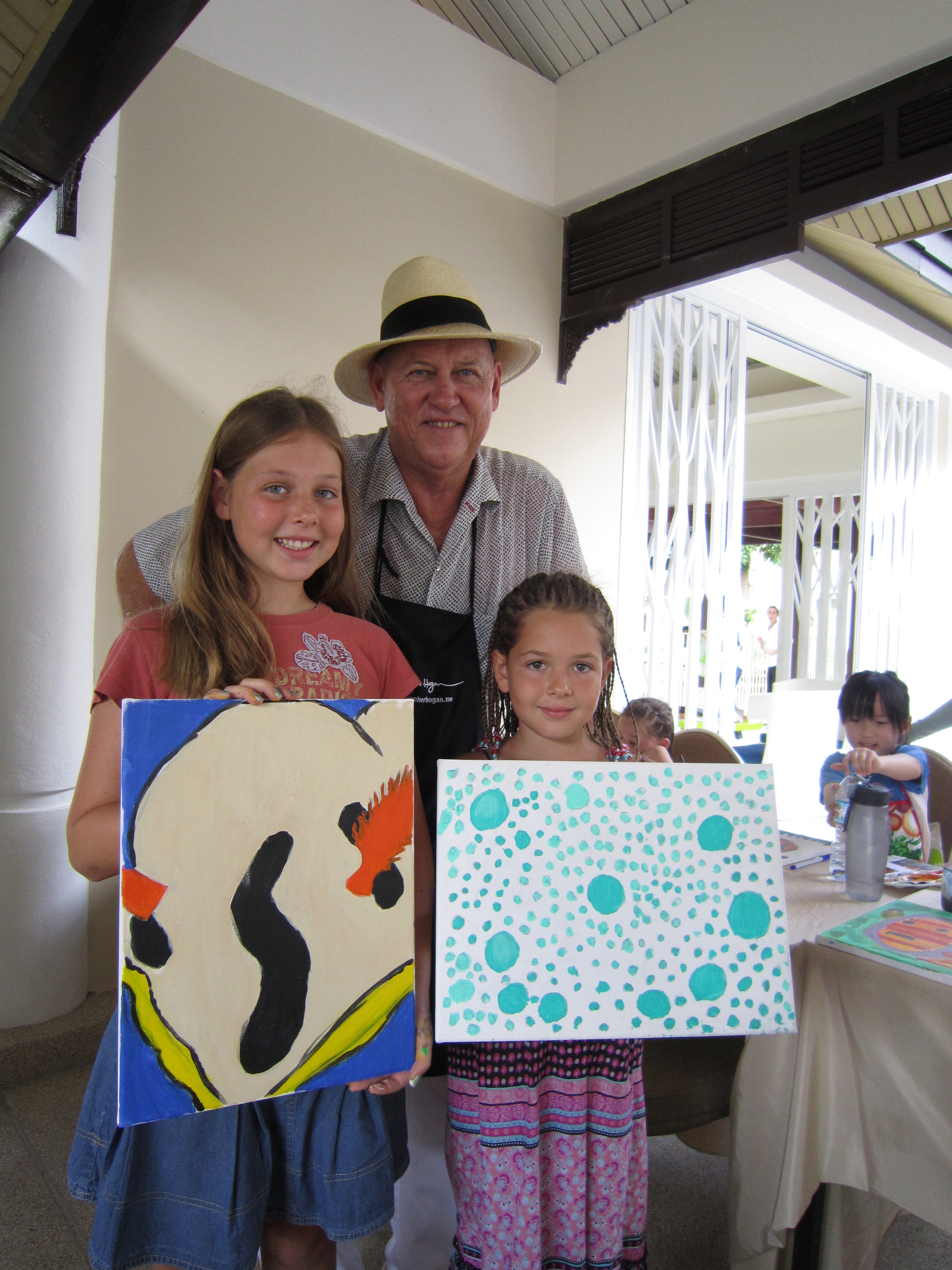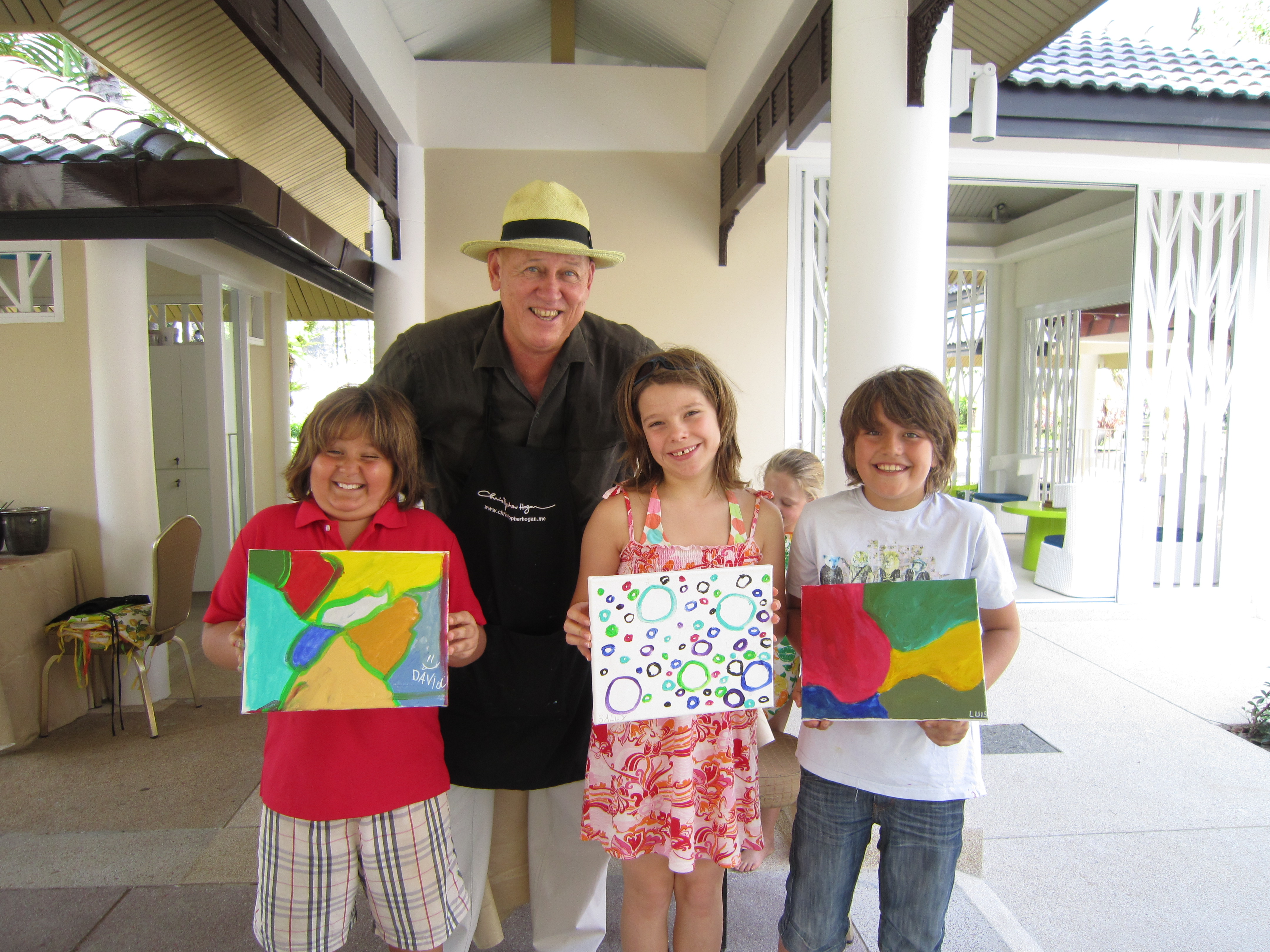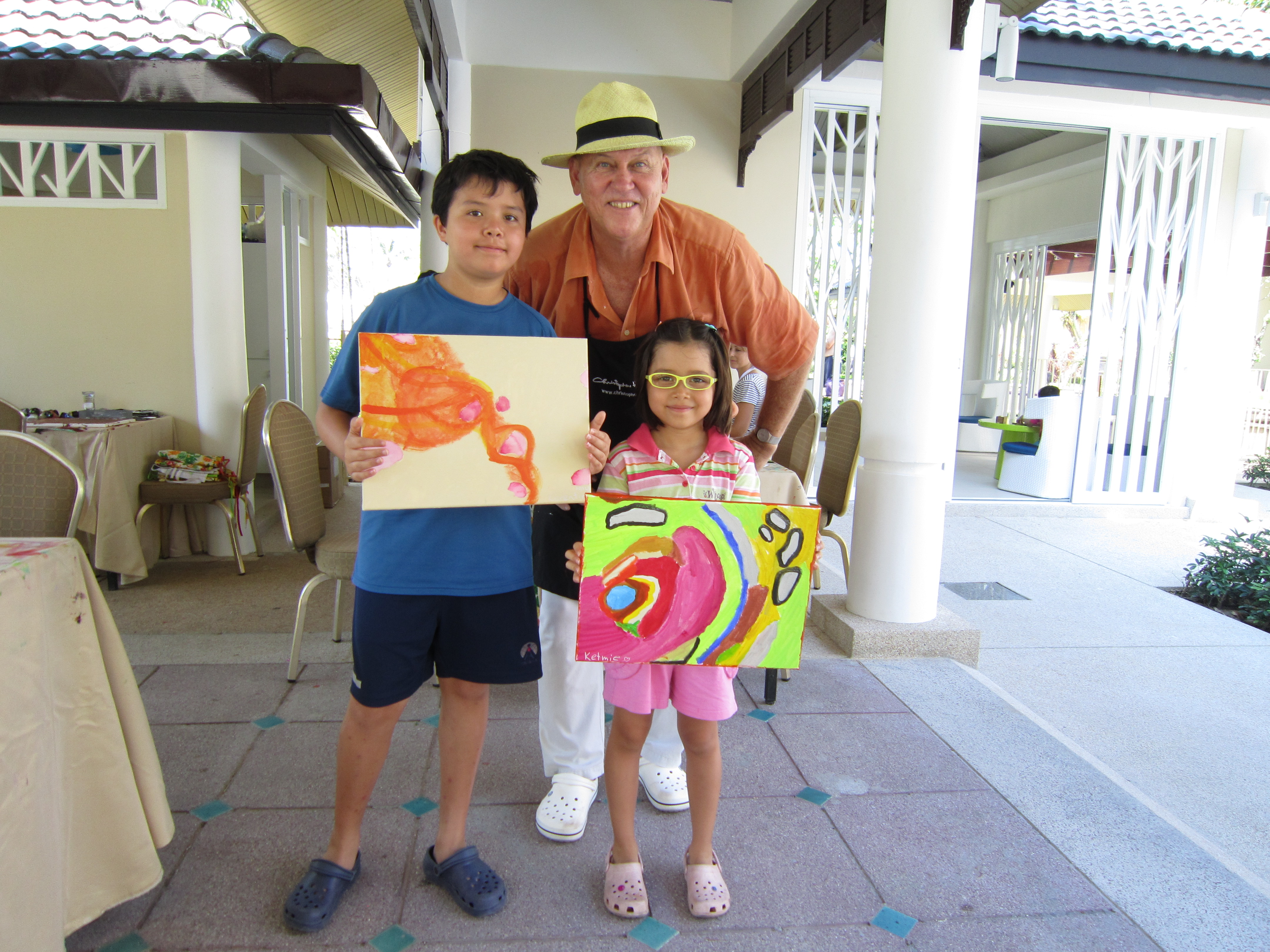 MY ARTIST IN RESIDENCE ART PROGRAM HAS TAKEN OFF HERE AT THE RESORT, WITH A FULL CLASS EVERY MORNING. I AM GREETED DAILY WITH THE BRIGHT SMILING FACES OF THE STAFF AT ANGSANA LAGUNA PHUKET’S KIDS CLUB AND THE GATHERING OF YOUNG GUESTS READY FOR THEIR ART CLASS. I CLEARLY EXPLAIN IN SIMPLE TERMS AND VISUAL ILLUSTRATION THE CONCEPT OF ABSTRACT PAINTING TO MY YOUNG CHARGES AND THEY QUICKLY GRASP THE CONCEPT. EXCITING TO SEE THEM INTERPRET CONTEMPORARY ABSTRACT PAINTING IN A VERY SHORT PERIOD OF TIME ONLY 2 HOURS AND I AM DELIGHTED WITH THE RESULTS.
