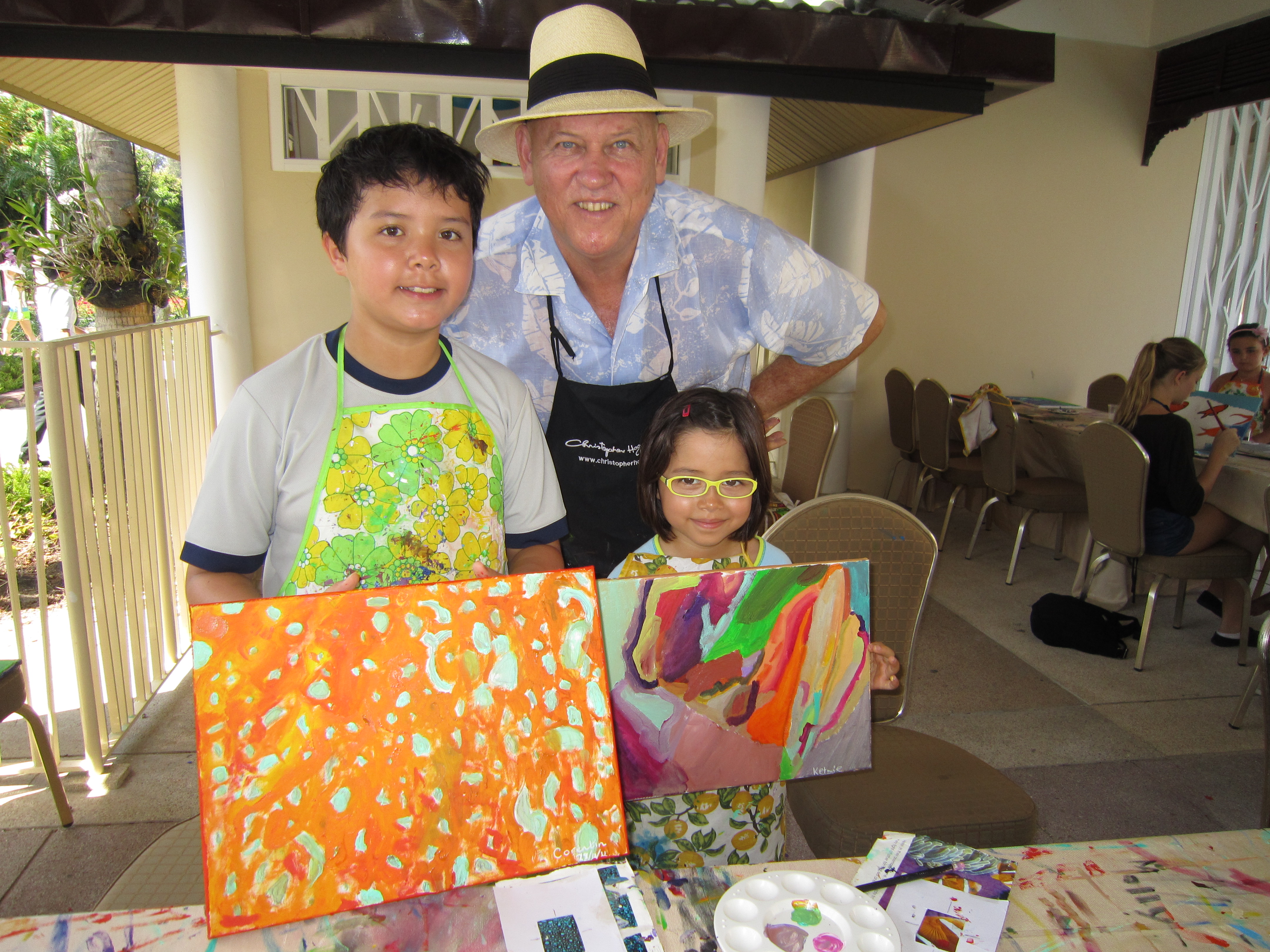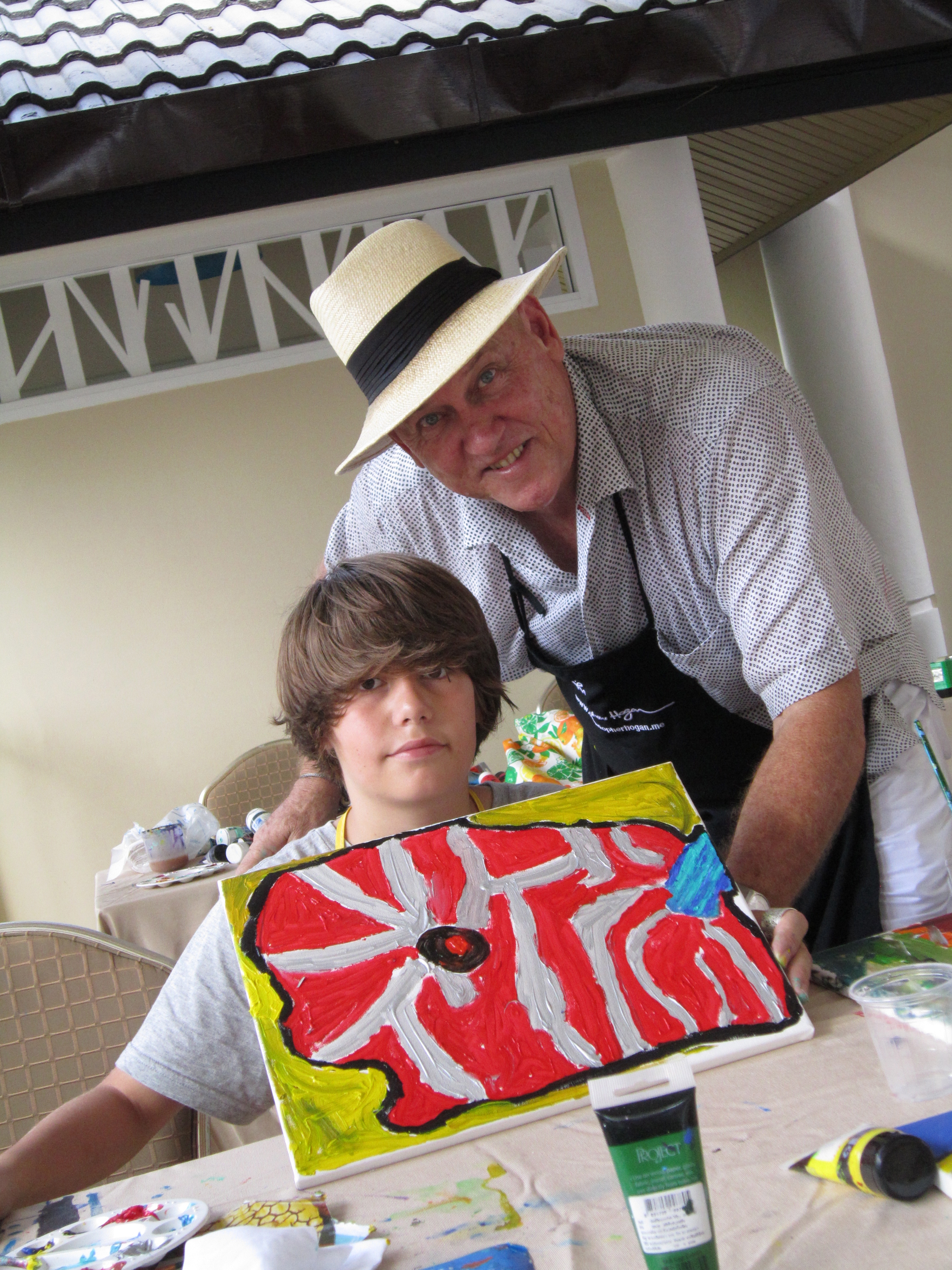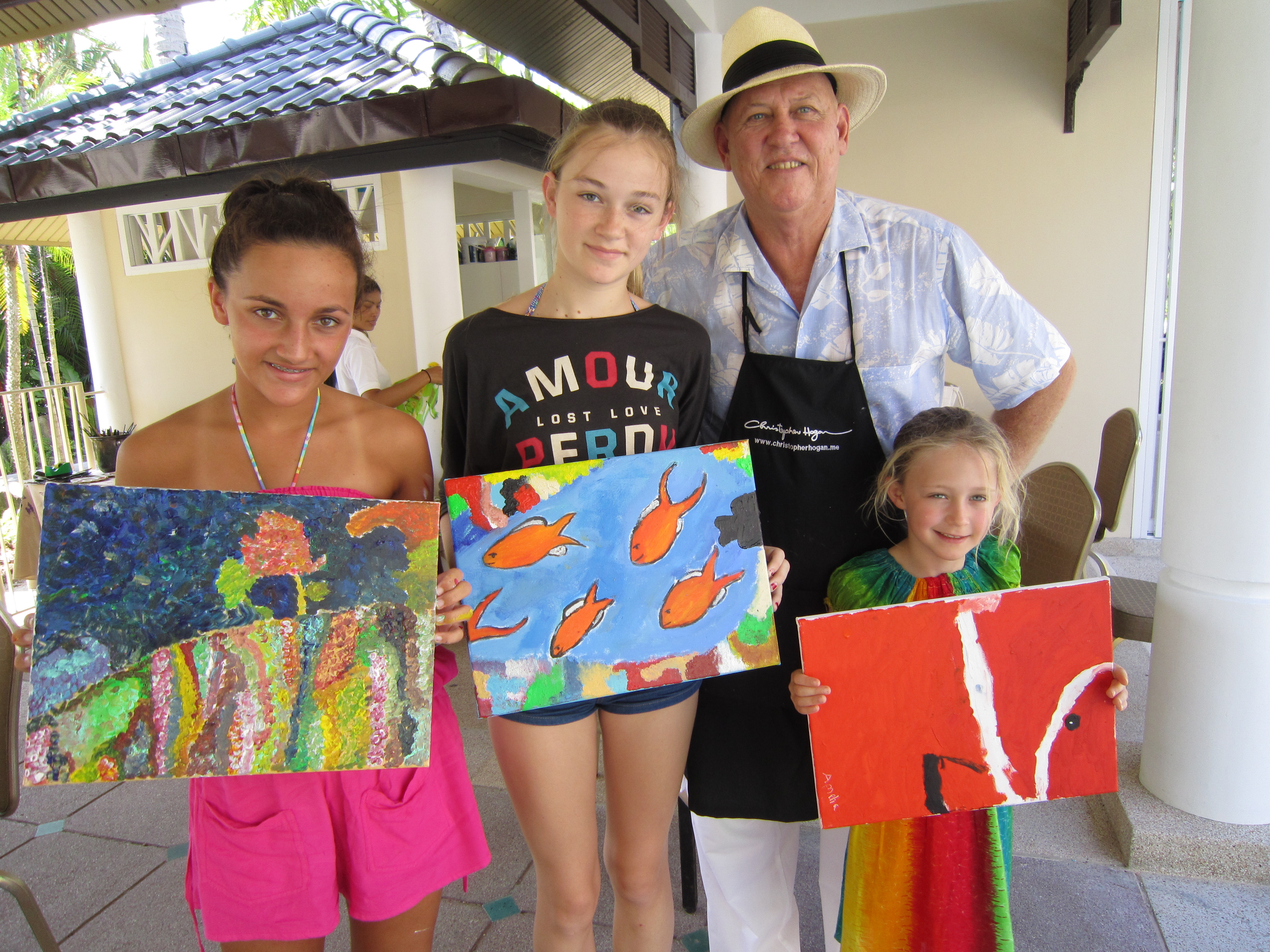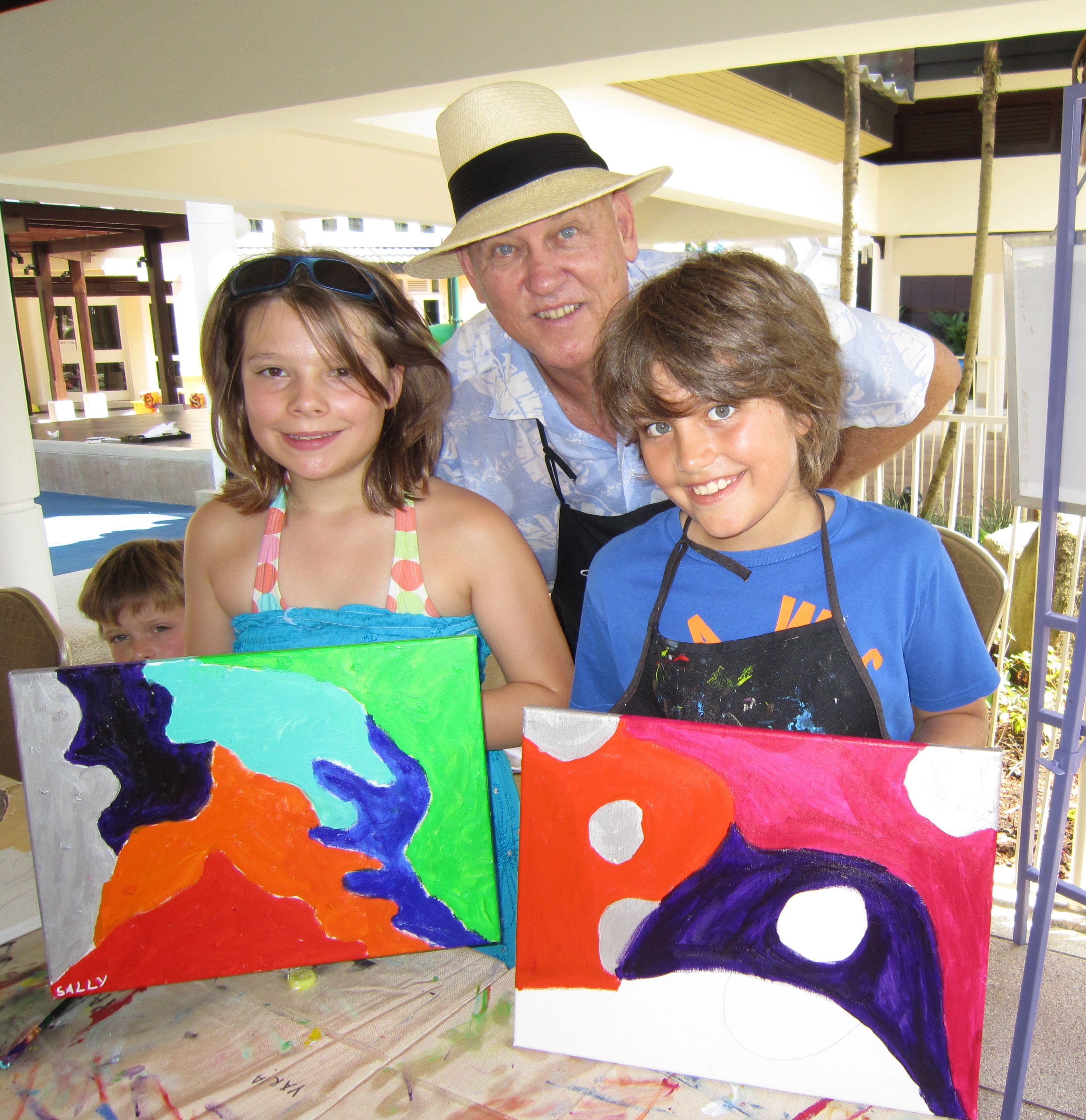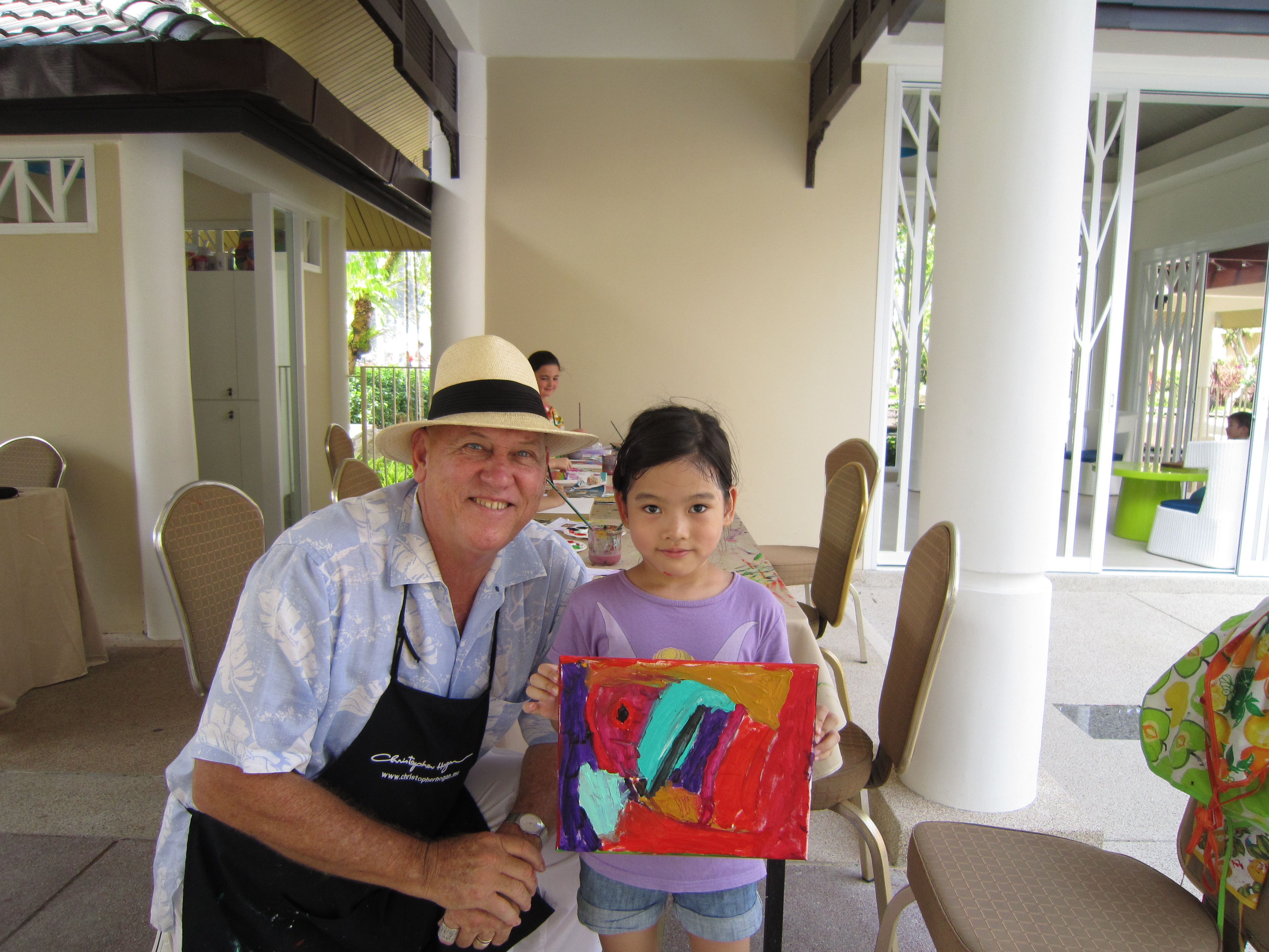 MY ARTIST IN RESIDENCE ART PROGRAM HAS TAKEN OFF HERE AT THE RESORT, WITH A FULL CLASS EVERY MORNING. I AM GREETED DAILY WITH THE BRIGHT SMILING FACES OF THE STAFF AT ANGSANA LAGUNA PHUKET’S KIDS CLUB AND THE GATHERING OF YOUNG GUESTS READY FOR THEIR ART CLASS. I CLEARLY EXPLAIN IN SIMPLE TERMS AND VISUAL ILLUSTRATION THE CONCEPT OF ABSTRACT PAINTING TO MY YOUNG CHARGES AND THEY QUICKLY GRASP THE CONCEPT. EXCITING TO SEE THEM INTERPRET CONTEMPORARY ABSTRACT PAINTING IN A VERY SHORT PERIOD OF TIME ONLY 2 HOURS AND I AM DELIGHTED WITH THE RESULTS.