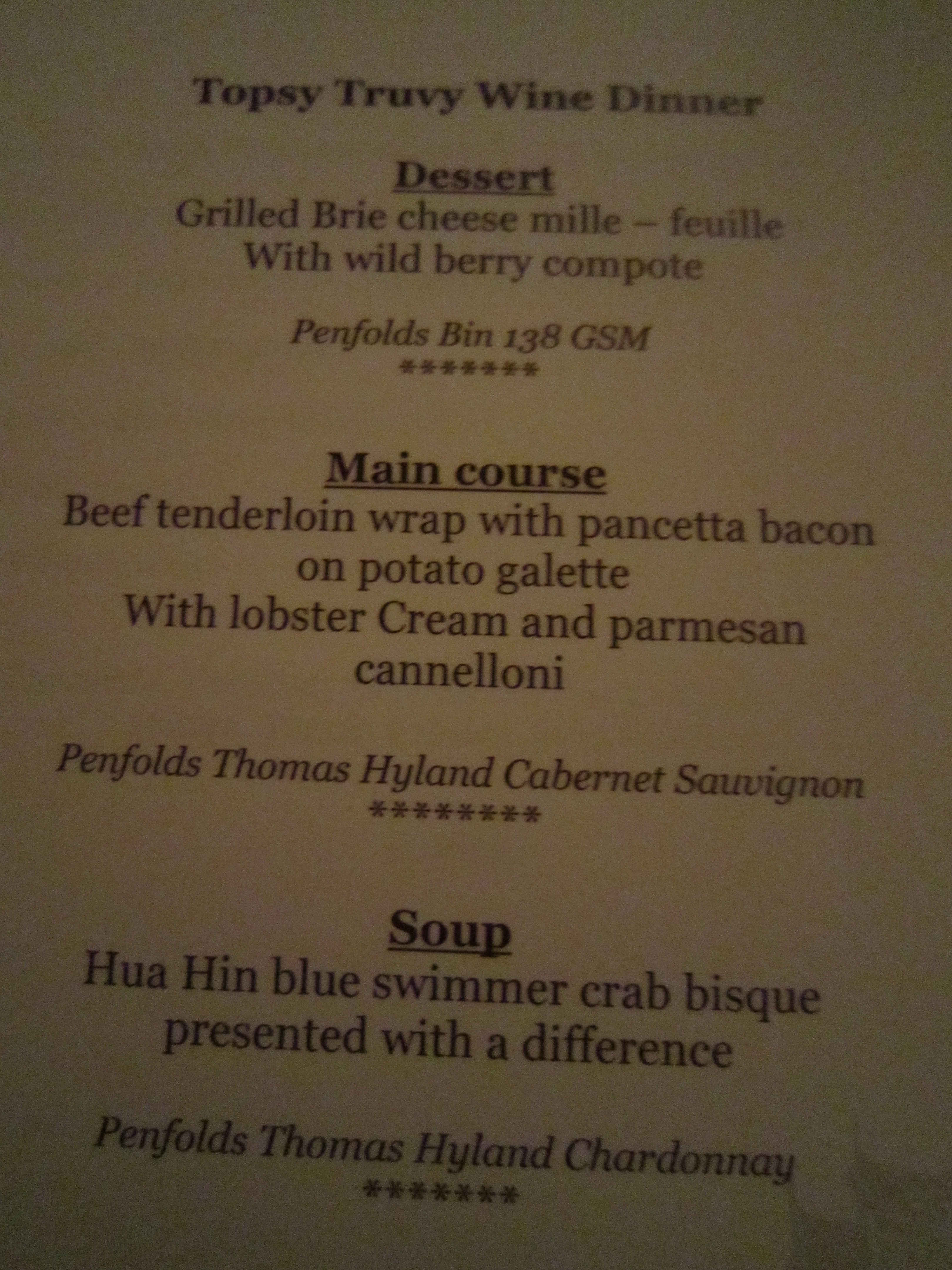Last night was the much talked about Penfolds wine dinner here at Anantara Hua Hin. Once again Tim Boda’s team of culinary guru’s excelled themselves with pairing food with some the wines from the great Australia wine company, Penfolds.