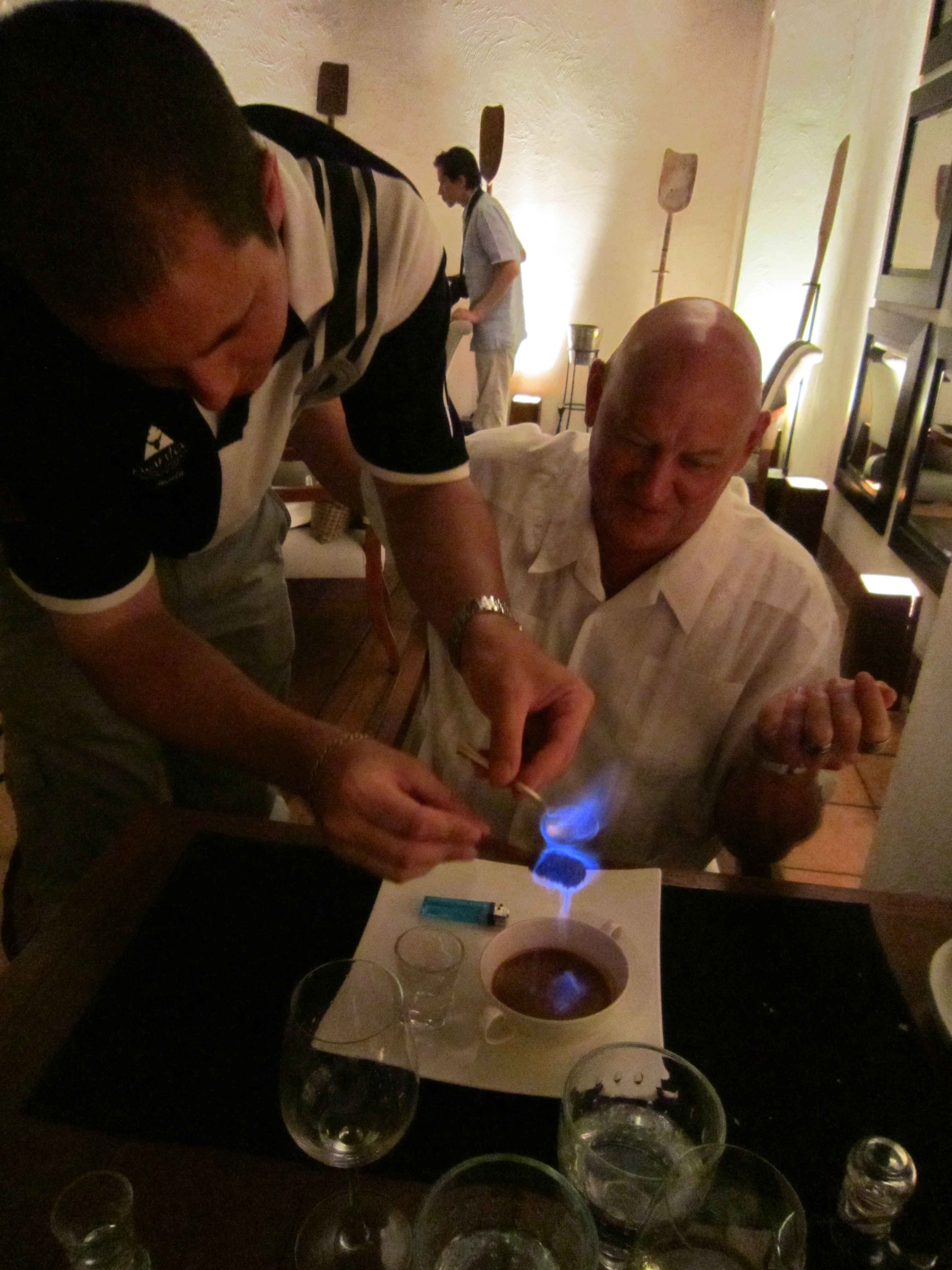 I did not take much notice of the name of the dinner, Topsy Turvy, but as soon as we arrived I started to ‘get-it’, especially when I was given the bill at the beginning of the meal and told by the staff that they were very pleased to say ‘Goodnight’….it was going to be an interesting dinner. True to their word, we were served desert & red wine, first course, followed by mains, soup – which was an interesting concept of lighting up Vodka and plunging it into your soup course, and finally appetiser accompanied by a sparkling rose to finish…all a lot of fun.