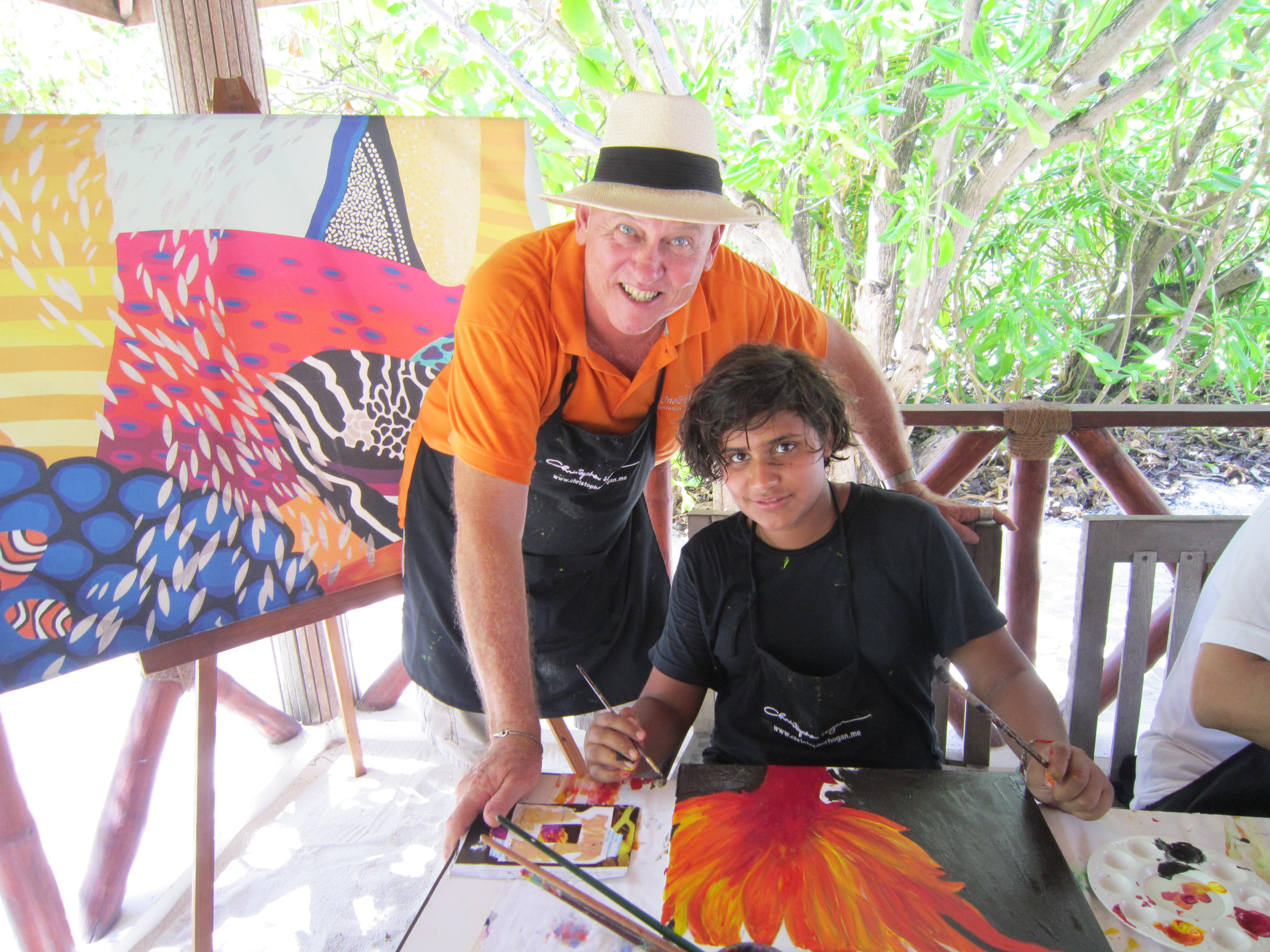 Nora, O&O Reethi Rah’s exuberant Guest Services Manager and her two young nieces joined my art class under the coconut trees and so I took the opportunity to teach them how to paint in the bold colours and patterns of the marine life that they had seen here on the reefs and waters of the Maldives.